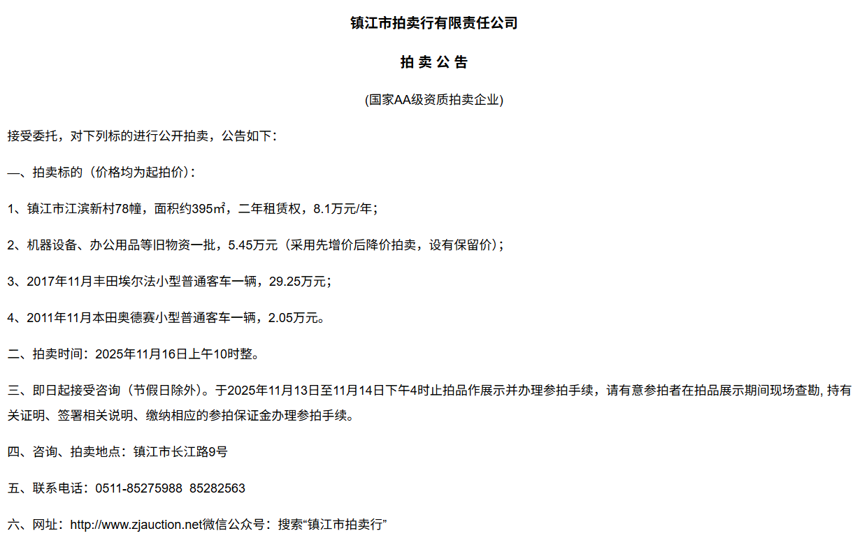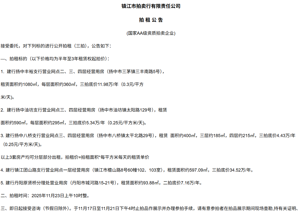 鎮江市拍賣行有限責任公司拍 租 公 吿(國家AA級資質拍賣企業)接受委托,對下列標的進行公開拍租(三拍),公告如下:—、拍租標的(以下價格均為半年至3年租賃權起拍價):1.  建行揚中豐裕支行營業網點二、三、四層經營用房(揚中市三茅鎮三豐南路5號),租賃面積約1080㎡,每層面積約360㎡,三拍底價11.98萬/年(0.3元/平方米/天)。2.  建行揚中油坊支行營業網點三、四層經營用房(揚中市油坊鎮太陽路129號),租賃面積約590㎡,每層面積約295㎡,三拍底價5.34萬/年(0.25元/平方米/天)。3. 建行揚中八橋支行營業網點三、四層經營用房(揚中市八橋鎮太平北路29號),租賃  面積約400㎡,三層約185㎡,四層約215㎡,三拍底價4.43萬/年(0.25元/平方米/天)。以上3套房產均可分層部分出租,拍租價=拍租面積*每平方米每天的租賃單價4. 建行鎮江團山路支行營業網點一層經營用房(鎮江市檀山路8號60幢102、103室),租賃面積約597.09㎡,三拍底價34.52萬/年。5. 建行丹陽原賢橋分理處營業用房(丹陽市城河路15-21號),租賃面積約93.88㎡,二拍底價7.16萬/年。二、拍租時間:2025年11月23日上午10時整。三、即日起接受咨詢(節假日除外)。于11月17日至11月21日下午4時止拍品作展示并辦理參拍手續,請有意參拍者在拍品展示期間現場查勘,持有關證明、簽署相關說明、繳納相應的參拍保證金辦理參拍手續。四、咨詢、拍租地點:鎮江市長江路9號五、聯系方式:0511-85275988   13655299933楊先生六、網址:http://www_zjauction_net.juju66.cn;微信公眾號:搜索“鎮江市拍賣行” 拍品清單2025.11.23序號名稱起拍價(元)標的說明1建行揚中豐裕支行營業網點二、三、四層經營用房(揚中市三茅鎮三豐南路5號),租賃面積約1080㎡,每層面積約360㎡三拍底價11.98萬/年(0.3元/平方米/天)1、1-3號房產均可分層部分出租,拍租價=拍租面積*每平方米每天的租賃單價;2、意向競拍人在拍賣前需持營業執照或身份證與委托方說明租賃房產經營業態,確定意向后出具房產承租用途承諾書,經委托方審核后,方可交納保證金參加競拍;3、租賃期限為半年至3年(承租方與出租方協商而定),承租方每半年或一年結付租金,租賃期間的水、電費用及其它相關費用均由承租方承擔;4、承租方不得用于經營和保管危險物品,不得用于開設餐飲、娛樂等可能嚴重影響消防安全、運營安全的經營業態,不得用于經營委托貸款、小額貸款等可能冒用委托方名義,帶來聲譽風險的經營業態。租賃期內,承租方不得破壞墻體結構,自行成就消防、安全等使用條件,不得擅自將租賃房屋轉租、轉讓給他人使用,否則委托方有權收回房屋;5、拍租成交后,承租方將租金交至出租方指定賬戶,傭金交至拍賣方賬戶(拍租傭金為該房屋一個月租金)。承租方憑租賃合同無息退還保證金。2建行揚中油坊支行營業網點三、四層經營用房(揚中市油坊鎮太陽路129號),租賃面積約590㎡,每層面積約295㎡三拍底價5.34萬/年(0.25元/平方米/天)3建行揚中八橋支行營業網點三、四層經營用房(揚中市八橋鎮太平北路29號),租賃面積約490㎡,每層面積約245㎡三拍底價4.43萬/年(0.25元/平方米/天)4建行鎮江團山路支行營業網點一層經營用房(鎮江市檀山路8號60幢102、103室),建筑面積約597.09㎡三拍底價34.52萬/年5建行丹陽原賢橋分理處營業用房(丹陽市城河路15-21號),建筑面積約93.88㎡二拍底價7.16萬/年